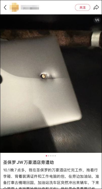 近日,一网友在社交媒体发文称,自己在巴西出差时遭遇持枪蒙面抢劫,包中自己用了五年的笔记本电脑为他挡下一枪。