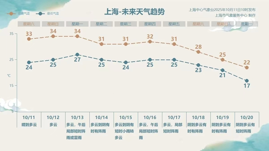 根据“上海天气发布”官微,上海今天最高气温在33℃附近。明后天的气温更上一层楼,最高气温可达34℃,上海10月中旬的最高气温纪录可能被连续击穿,白天外出仍需注意防暑防晒。